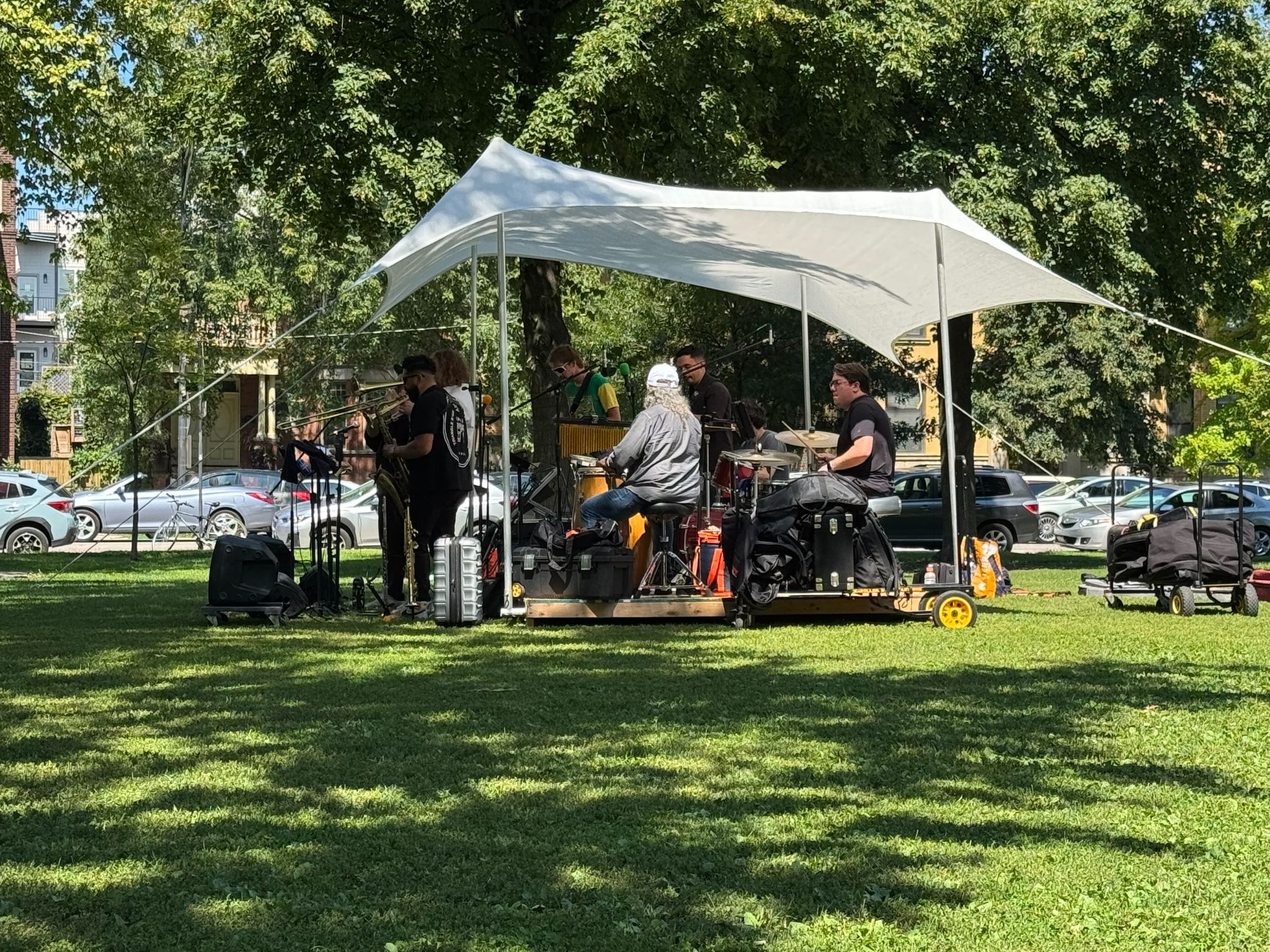 August 2025’s final Live On Logan performance brought Marcel Bonfim’s Funkeria to Logan Square’s Palmer Square Park for an afternoon of funk jazz music straight from 1970s Brazil. The group, an eight-man ensemble, had performed the prior day at Pritzker Pavilion as part of the 2025 Chicago Jazz Festival and brought on all the funk the gathered crowd could handle.